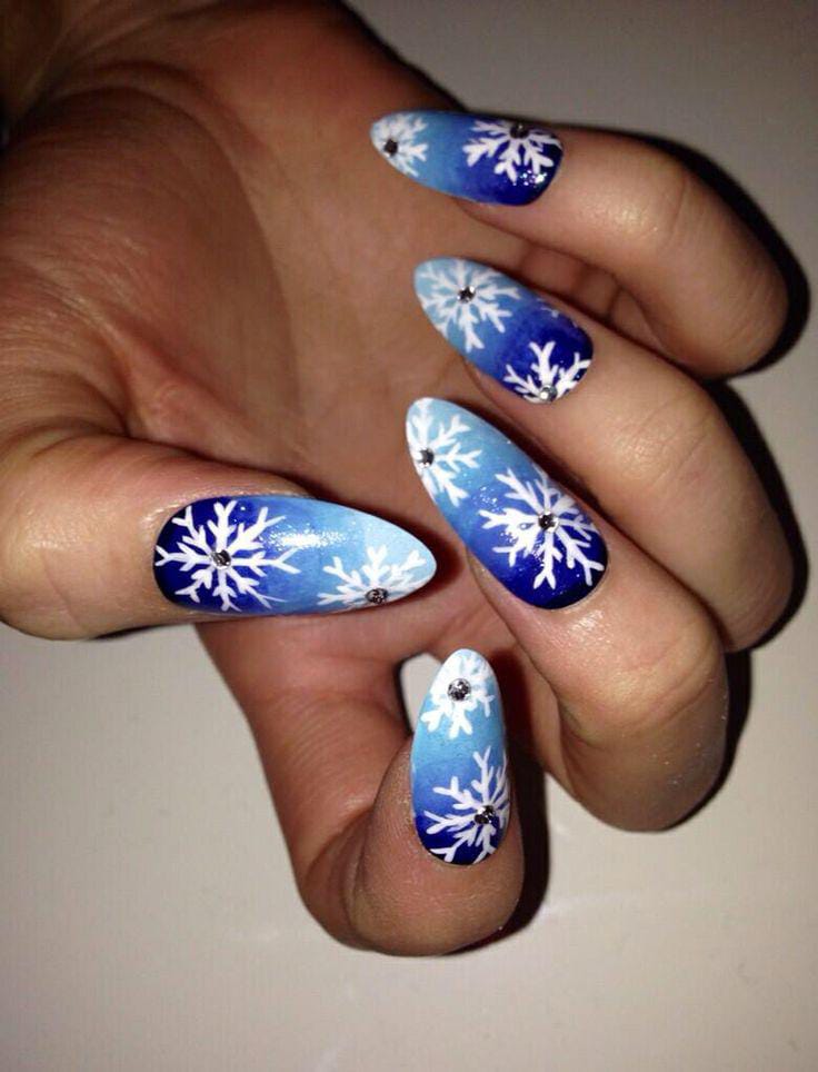 A smooth ombré blend of icy blue to deep navy, topped with bold white snowflakes and tiny rhinestones for a sparkling winter wonderland Christmas look.