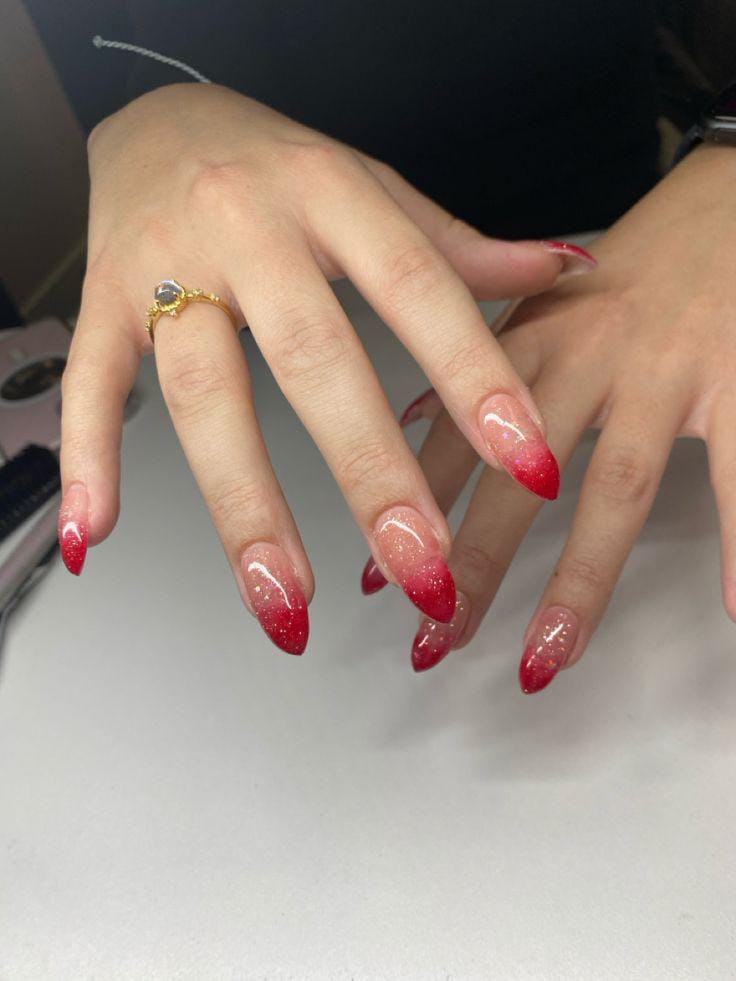 Classic red ombré nails fading into a natural base, with a subtle shimmer finish that gives off a timeless Christmas holiday glamour.