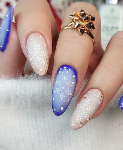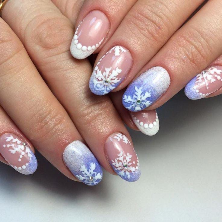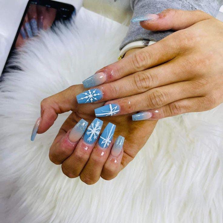 Soft nude tones ombre into frosty blue tips with intricate snowflake accents, creating an icy yet elegant Christmas charm.
