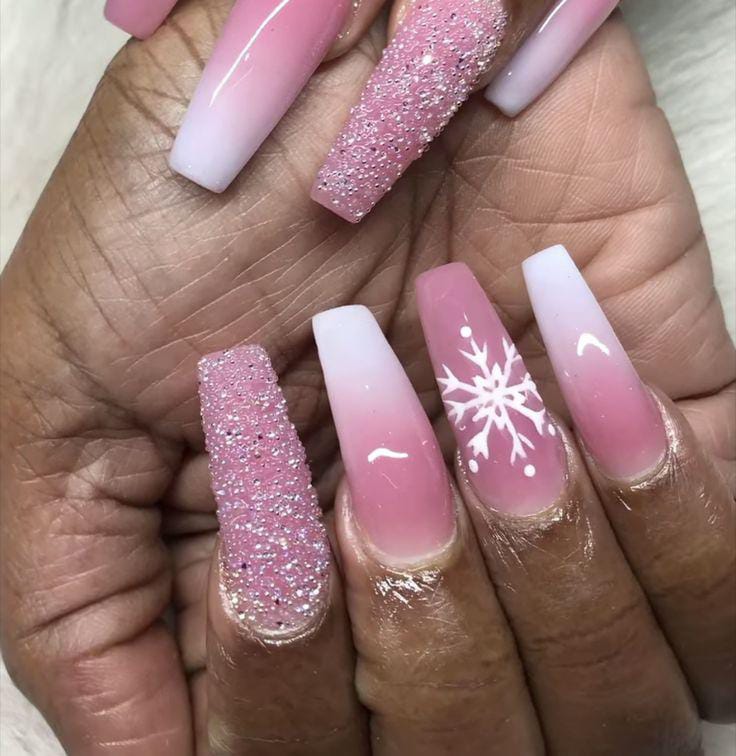 This design blends soft pink and white ombré tones with a glitter accent and a delicate snowflake detail, giving a frosty, feminine winter vibe that feels cozy yet festive Christmas.