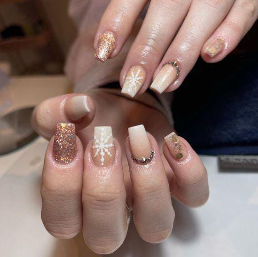 A warm nude and gold ombré base shines with hints of glitter, snowflake accents, and subtle rhinestone touches—perfect for a classy, golden Christmas holiday look.