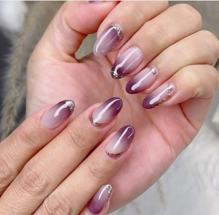 Soft plum shades melt into sheer nude bases, topped with subtle glitter along the cuticles for a graceful, ombré look that feels both Christmas festive and refined.