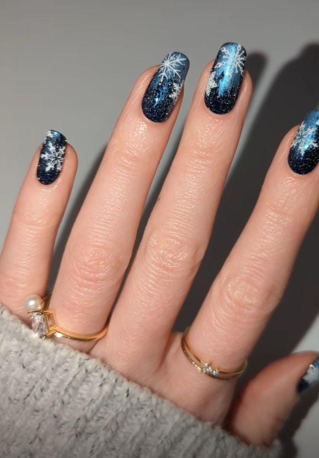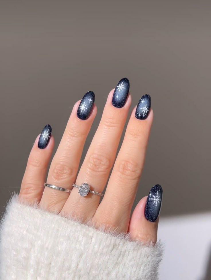 Deep navy ombre nails sprinkled with subtle glitter and glowing star-like snowflakes, capturing the beauty of a starlit winter Christmas night.