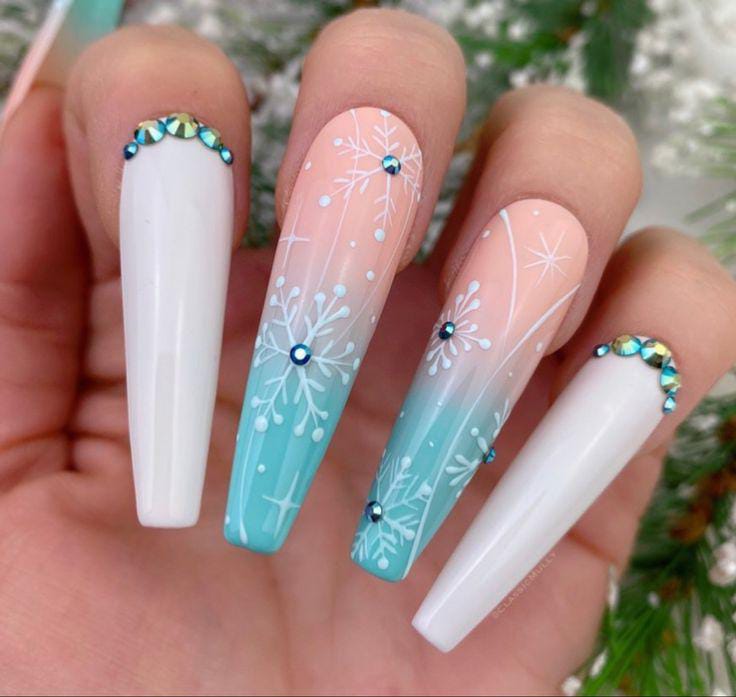 This design features long coffin nails with a soft nude-to-turquoise ombre base, accented by delicate white snowflakes and shimmering rhinestones, creating a dreamy winter wonderland Christmas vibe.