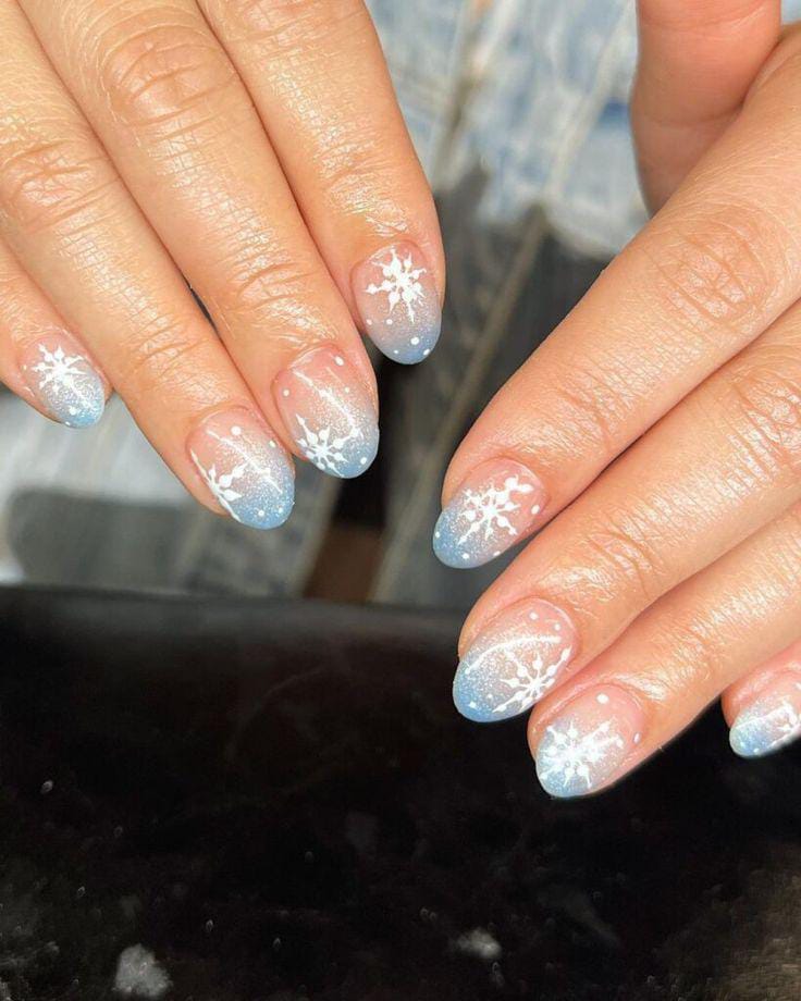 Short, natural nails are graced with a subtle blue ombre fade and hand-painted white snowflakes, giving a simple yet enchanting frosty look perfect for the Christmas season.