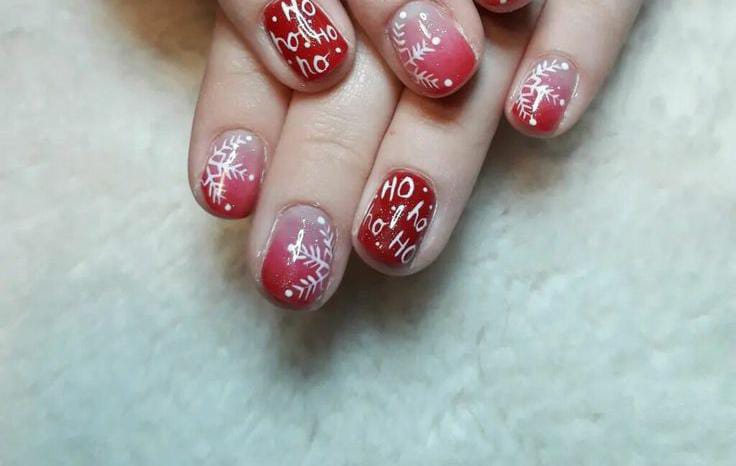 A festive red ombre base meets playful white snowflakes and “Ho Ho Ho” lettering, radiating cheerful Christmas spirit with a cozy, joyful flair.