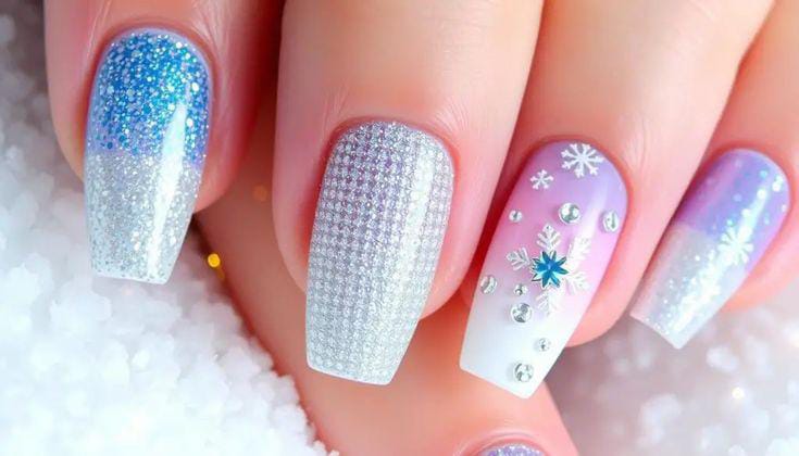 Cool blue and white ombre nails sprinkled with glitter and snowflake art, creating a frosty, festive look inspired by winter Christmas mornings.