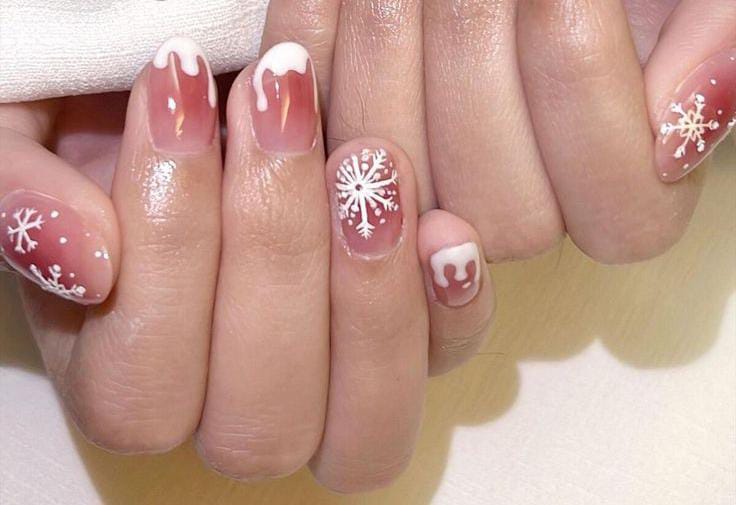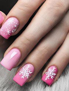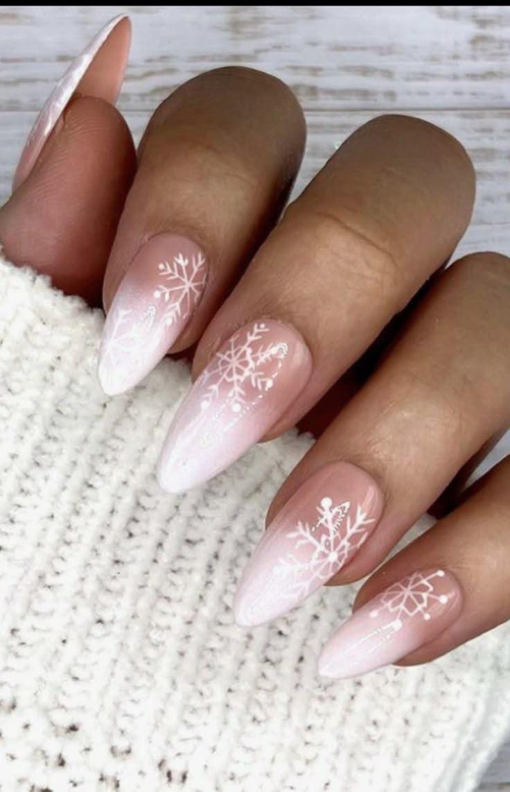 A delicate pink-to-white ombre with dainty white snowflake art, perfect for a soft, feminine, and cozy Christmas holiday look.