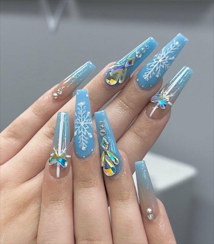Long, bright blue ombre nails with intricate snowflake art and crystal embellishments bring a glamorous “frozen” sparkle to your Christmas festive look.