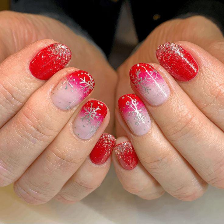 A red-to-pink ombre base with shimmering silver snowflakes captures the warmth and joy of Christmas, blending classic holiday hues with a soft, frosty finish.
