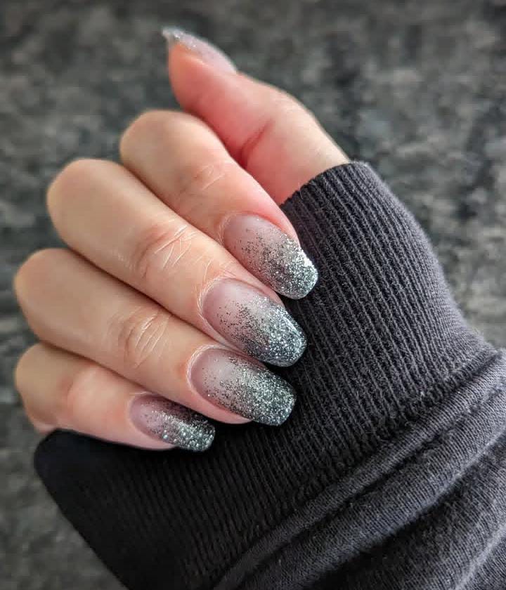 This simple yet stunning design fades from a clear base into shimmering silver glitter ombre, giving the illusion of freshly fallen snow for a minimal Christmas wintry vibe.
