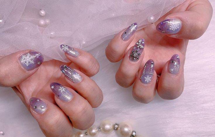 Soft lavender-to-silver ombre nails adorned with snowflakes, rhinestones, and shimmer — a perfect frosty yet glamorous Christmas holiday look.