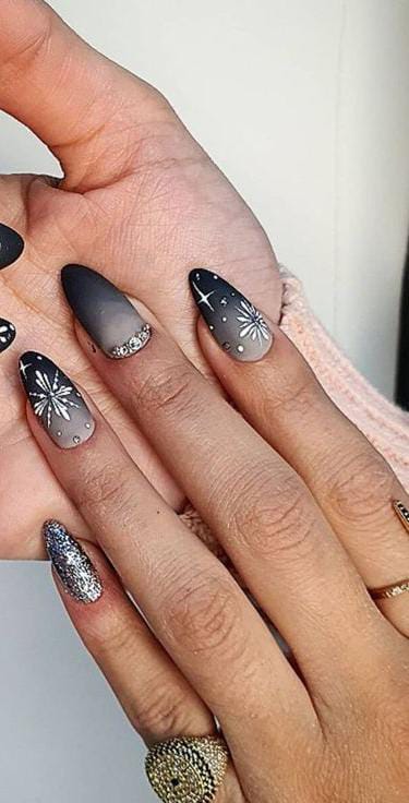 Matte black and grey ombre nails adorned with metallic snowflakes and subtle rhinestone touches — a chic, moody winter Christmas statement.