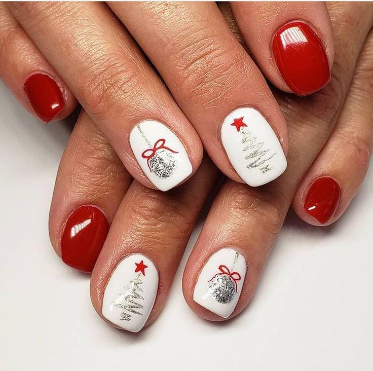 Bold red nails pair with crisp white accent nails showcasing a simple silver ornament and soft, subtle Christmas tree art for a clean yet festive vibe.