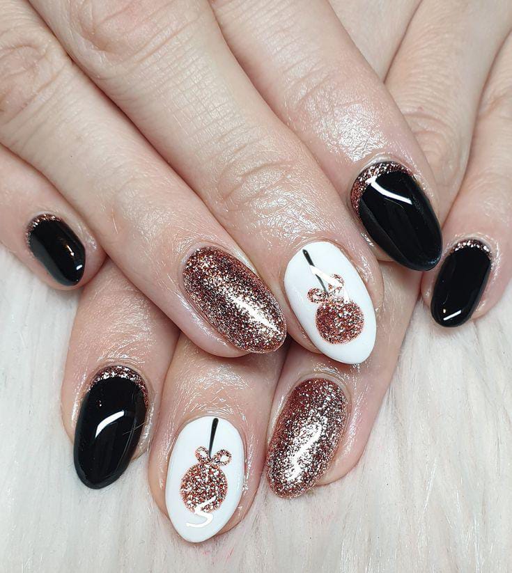 A chic blend of glossy black nails and shimmering copper glitter is balanced with white accent nails showcasing copper ornaments. The look feels classy and modern while still bringing that warm holiday sparkle.
