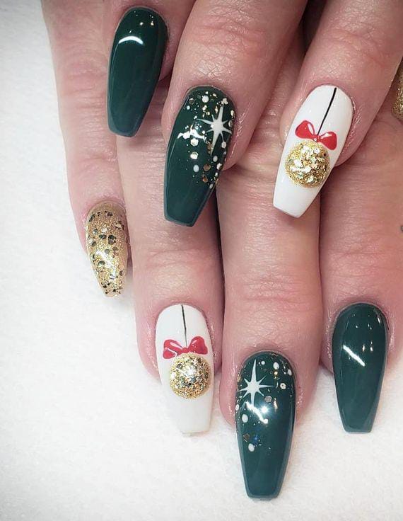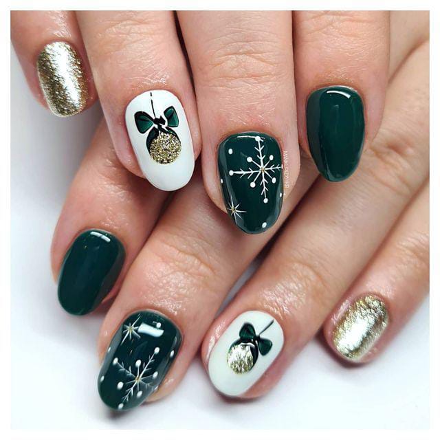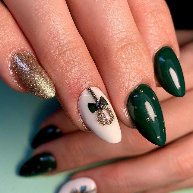 Deep green nails paired with gold glitter and white accent nails decorated with gold ornaments create a luxurious Christmas feel. The style is bold, festive, and perfect for anyone who loves rich holiday colors.
