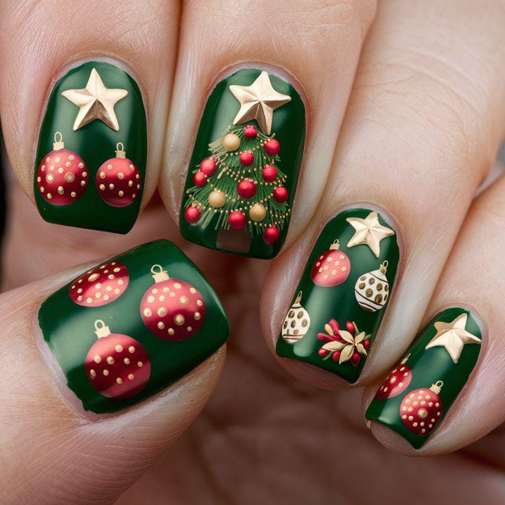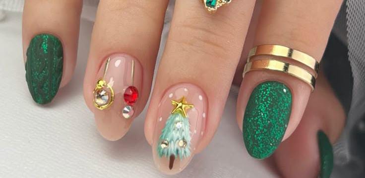 Deep green shimmer nails pair beautifully with accent nails featuring 3D ornaments and a decorative Christmas tree, creating a glam and luxurious holiday feel.