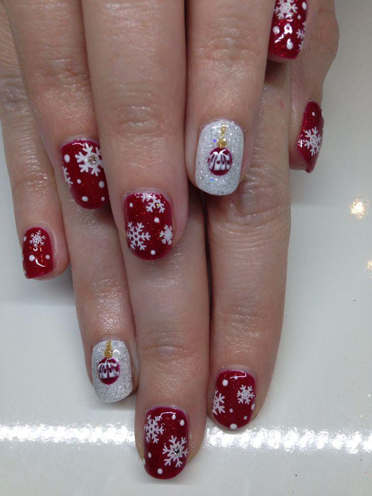 Glittery red nails with white snowflakes are paired with silver-white accent nails featuring small red ornaments. The combination gives a soft, wintry feel with a fun pop of Christmas holiday charm.