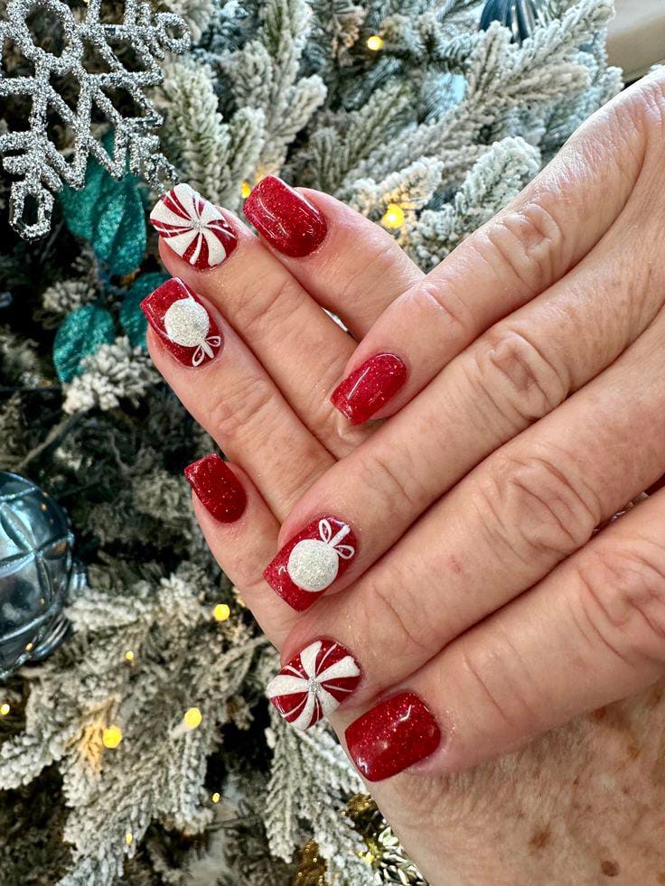 Bright red glitter nails are combined with white peppermint swirls and sparkly Christmas ornament accents, giving the set a festive, candy-inspired feel.