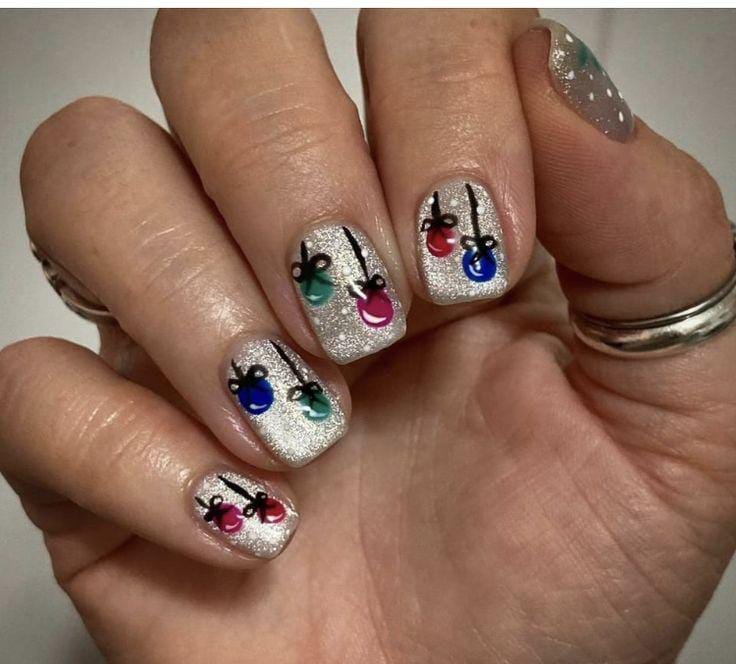 Silver glitter nails decorated with small, colorful ornaments create a fun, playful vibe that feels cheerful and perfectly Christmas holiday-ready.