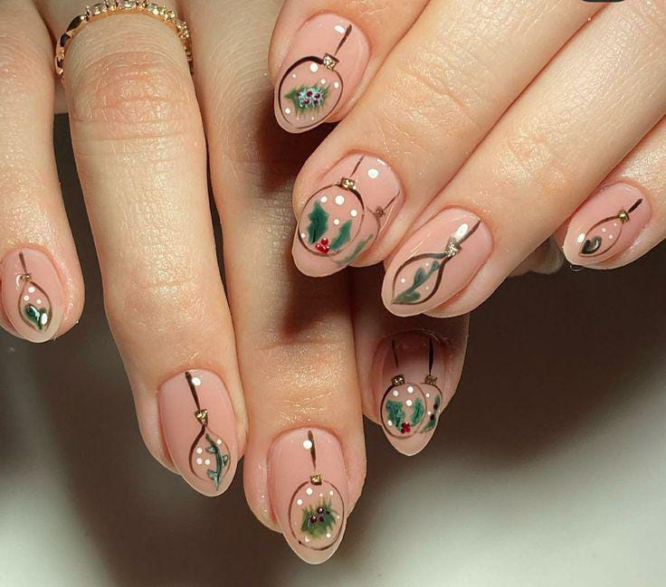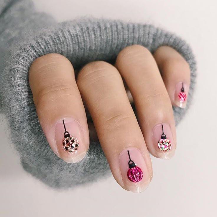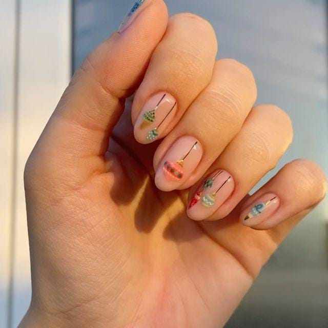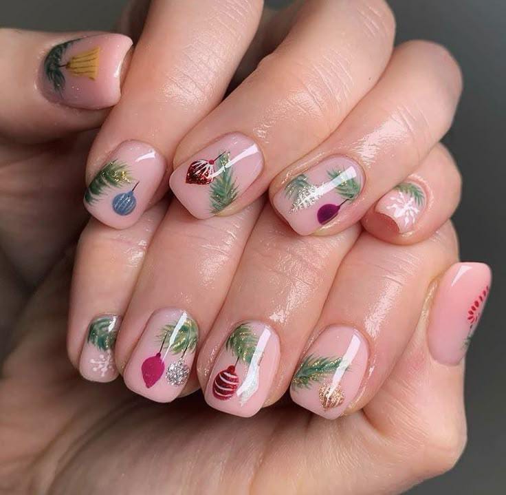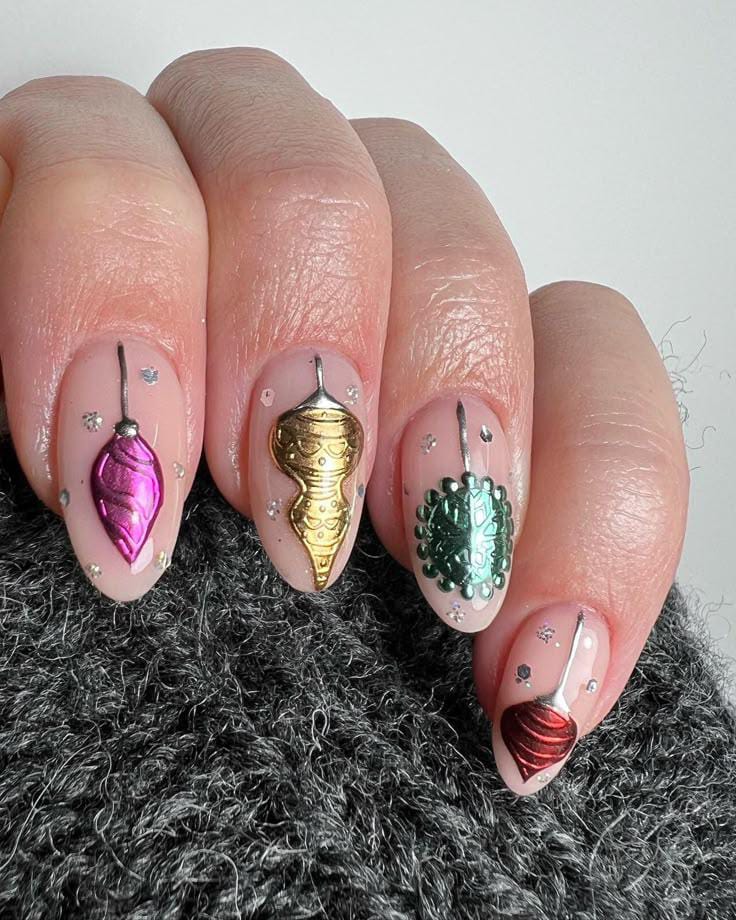These nails feature small, colorful ornaments over a nude base, creating a clean Christmas look. The design feels light, modern, and perfect for someone who prefers subtle holiday accents.
