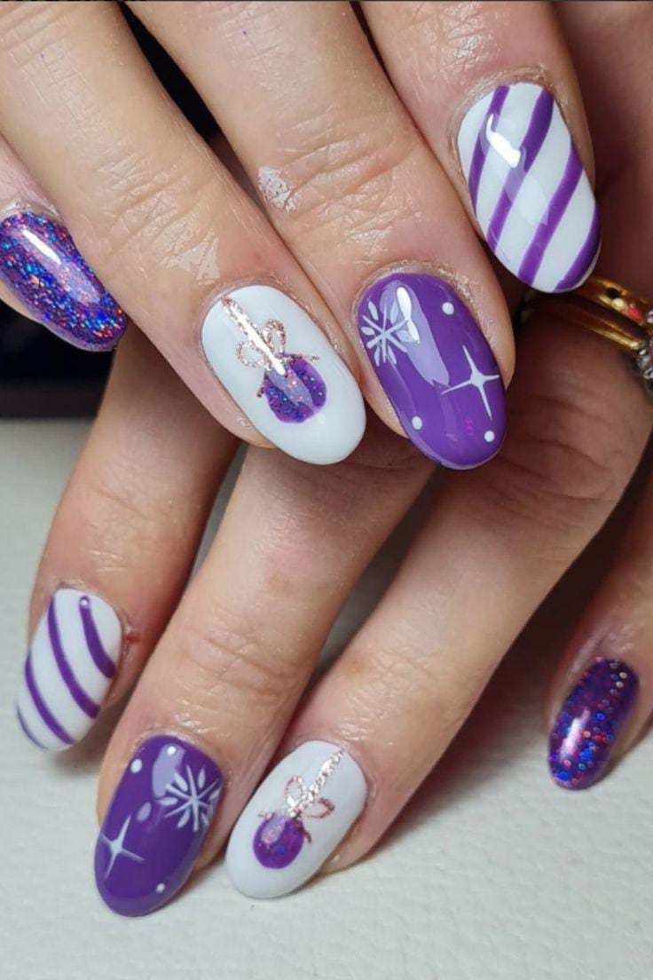 This design mixes soft white nails with simple purple ornament and tree accents, paired with glossy purple nails for a sweet, subtle Christmas look.