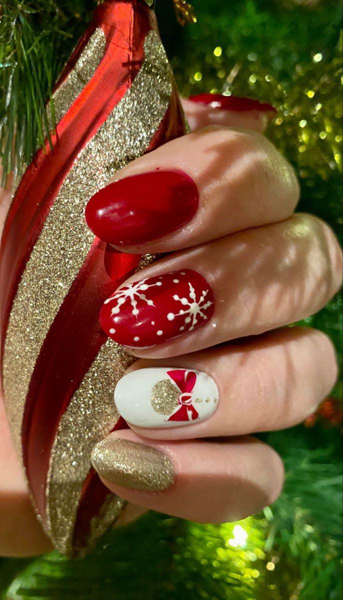 This design mixes deep red polish with glittery gold accents, while white nails feature cute ornament art topped with little bows. It feels festive, cozy, and perfectly classic for Christmas.