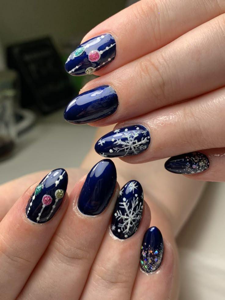 These glossy navy nails showcase shimmering ornaments and delicate white snowflakes, bringing together both Christmas holiday lights and winter magic. The contrast of dark blue with bright sparkles makes it striking yet seasonal.