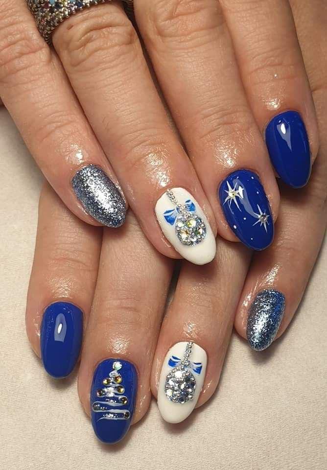 A mix of royal blue, silver glitter, and white accents is elevated with crystal-encrusted ornament designs. The overall feel is bold, glamorous, and perfect for anyone who loves a luxurious Christmas nail look.