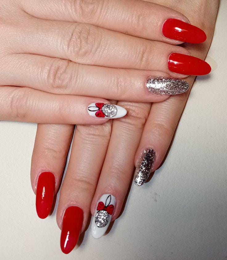 This design mixes classic red polish with silver glitter accents, while white nails feature cute ornament art topped with bright red bows for a christmas festive, cheerful look.