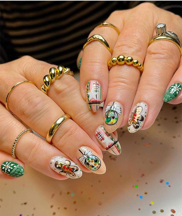 This design blends plaid, ornaments, gingerbread motifs, and textured winter patterns for a fun, eclectic Christmas look. It feels joyful and artsy, like a collection of festive decorations brought together on the nails.