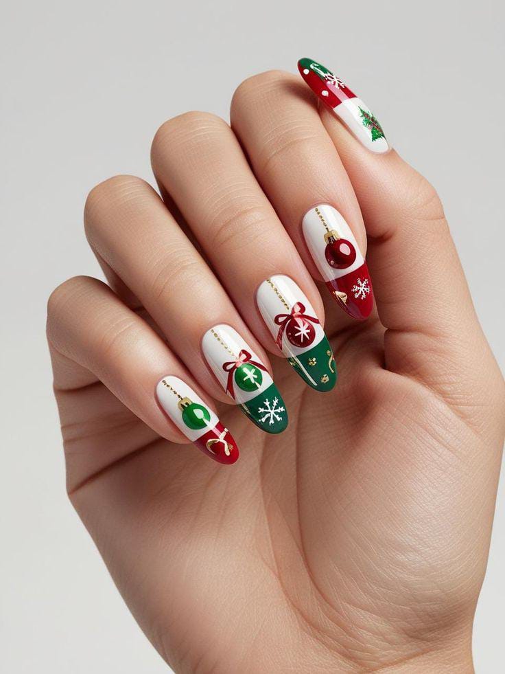 Alternating red, green, and white nails decorated with ornaments, snowflakes, and ribbon-like lines create a clean and classic Christmas palette. The design is polished, cheerful, and full of holiday spirit.