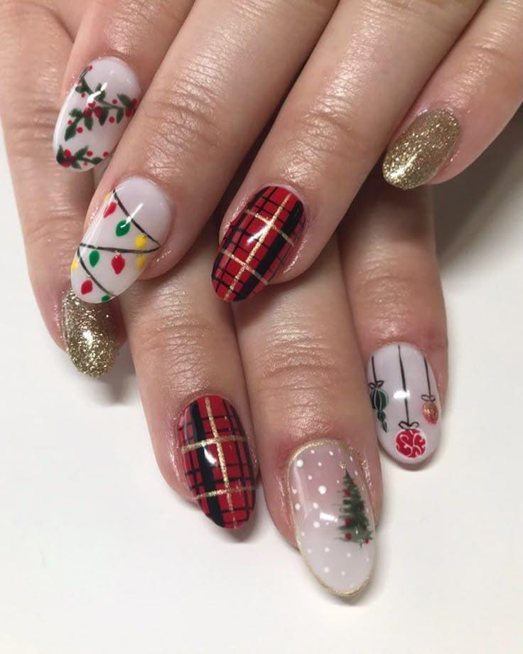 A blend of red plaid, gold glitter, holiday lights, and tiny ornaments creates a lively, full-of-character Christmas set. It feels cozy and traditional, like all the classic holiday patterns wrapped into one cheerful manicure.