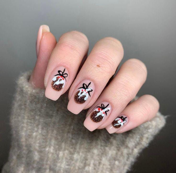 These nails feature adorable Christmas pudding ornaments on a nude base, combining warm brown glitter with soft white icing details. The look is cute, festive, and perfect for someone who loves holiday treats turned into nail art.