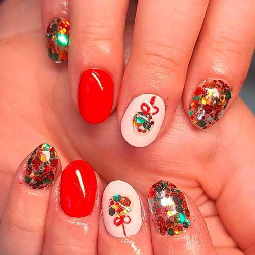 This design mixes bold red and soft white nails with colorful glitter accents and tiny ornament art, creating a playful and cheerful Christmas look. It feels bright, fun, and full of holiday sparkle.
