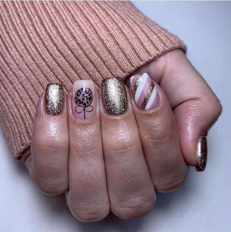 A blend of rose-gold glitter, soft pink tones, and striped candy-cane accents gives this look a chic holiday feel, while the delicate ornament design adds a sweet Christmas festive touch. It’s elegant, warm, and modern.