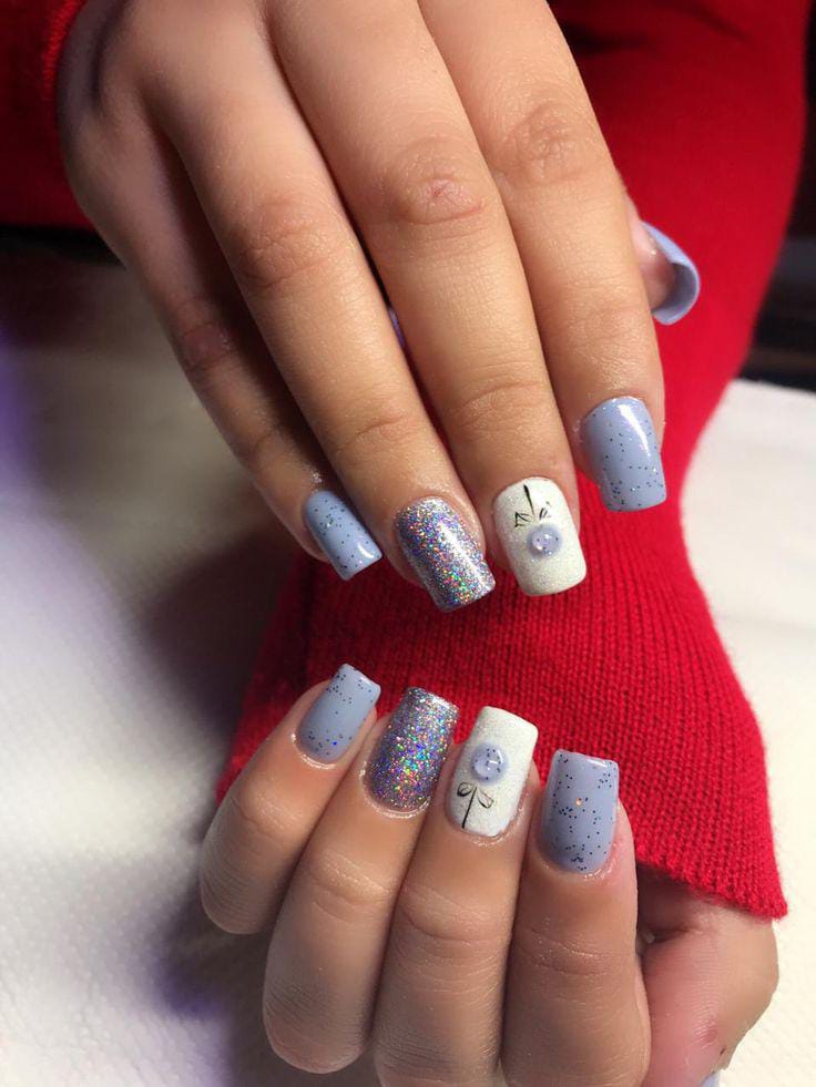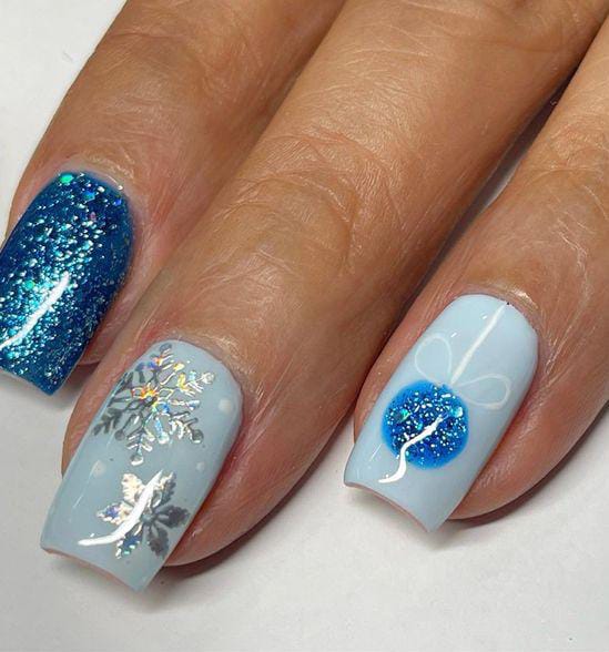 Icy blue nails mixed with deep blue glitter and holographic snowflake accents create a wintry, sparkling effect, topped off with a bright blue ornament design for a classic Christmas-in-blue look. It feels crisp, cool, and festive.