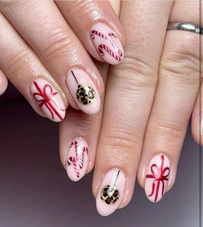 This design features a soft nude base topped with sparkly ornament shapes in red and silver, giving the nails a simple yet festive look. The thin black strings and tiny bows add a cute, minimalist Christmas touch.