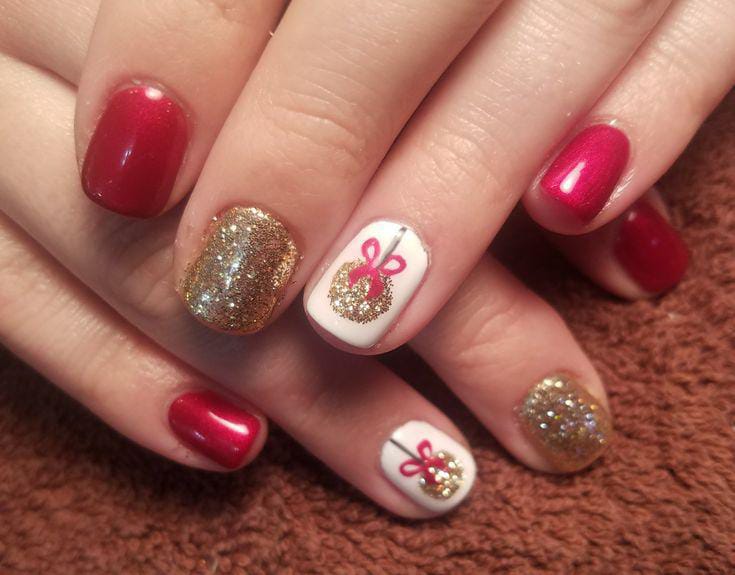 Rich red nails pair beautifully with gold glitter and a crisp white accent featuring a bold ornament and bow. The combination feels timeless and warm, perfect for a traditional Christmas look.