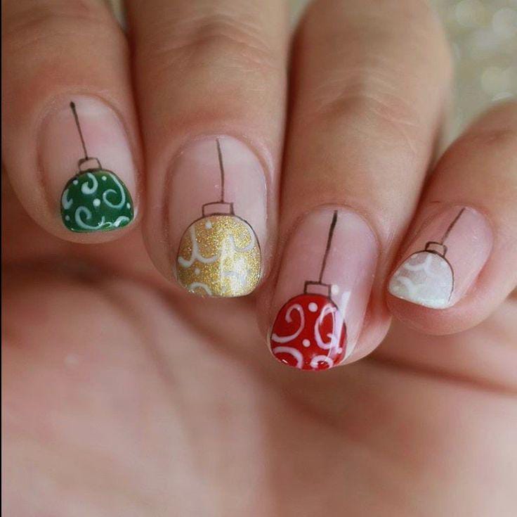 These nails keep a clean, sheer base with simple green, gold, red, and white ornaments tips drawn as if hanging from thin strings. The look is light, modern, and subtly Christmas festive.