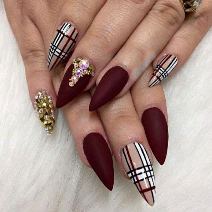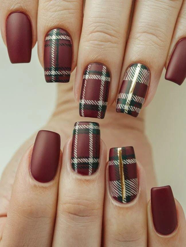 Rich matte burgundy nails paired with intricate plaid designs accented by gold lines. This look blends classic Christmas tones with a sophisticated, modern finish.