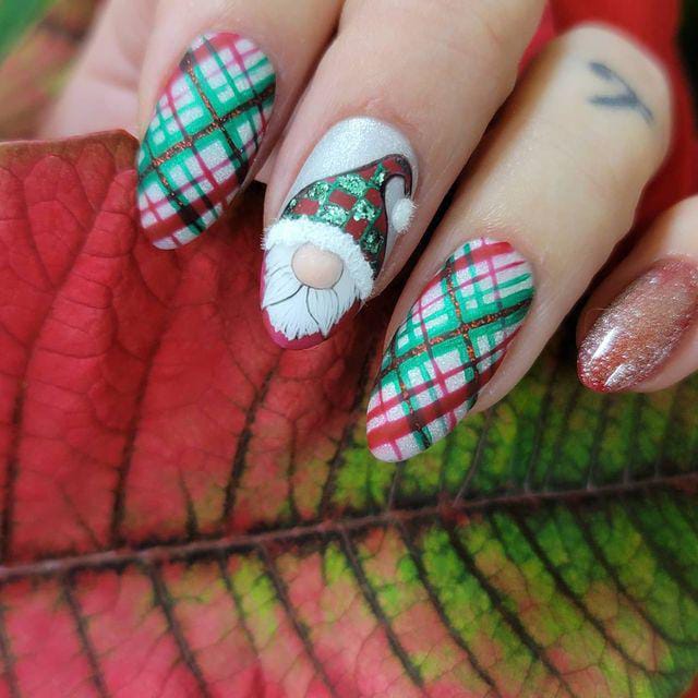 Bright red and green plaid nails meet a cute Christmas gnome accent, creating a fun and whimsical holiday vibe full of cheerful color and sparkle.
