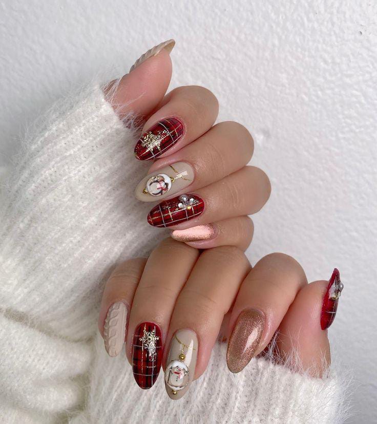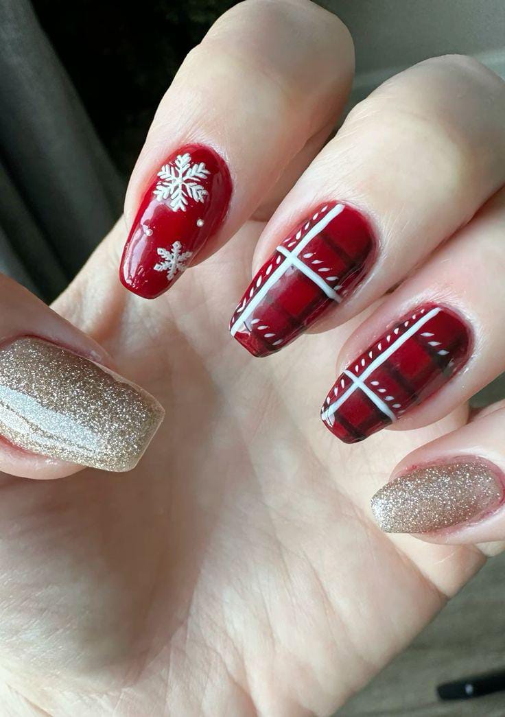 A mix of rich red plaid, gold shimmer, and creamy nude tones decorated with snowflakes and tiny gems gives a luxurious Christmas festive vibe.
