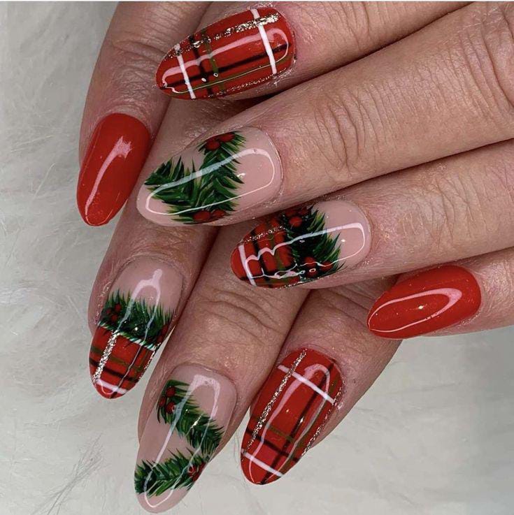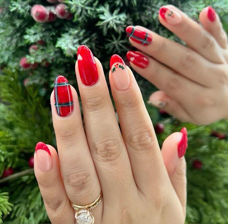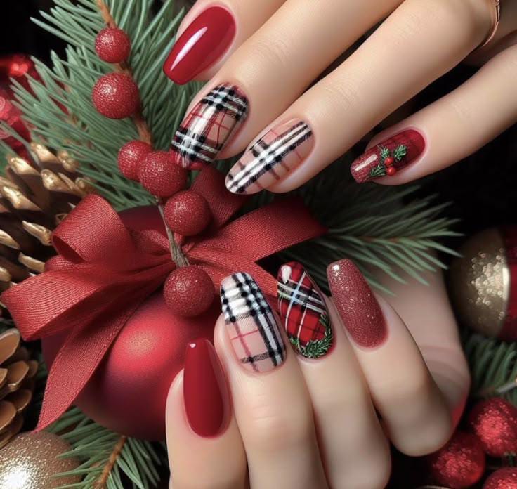 Glossy red nails paired with plaid patterns and subtle holly details create a classic, polished Christmas look that feels timeless and joyful.