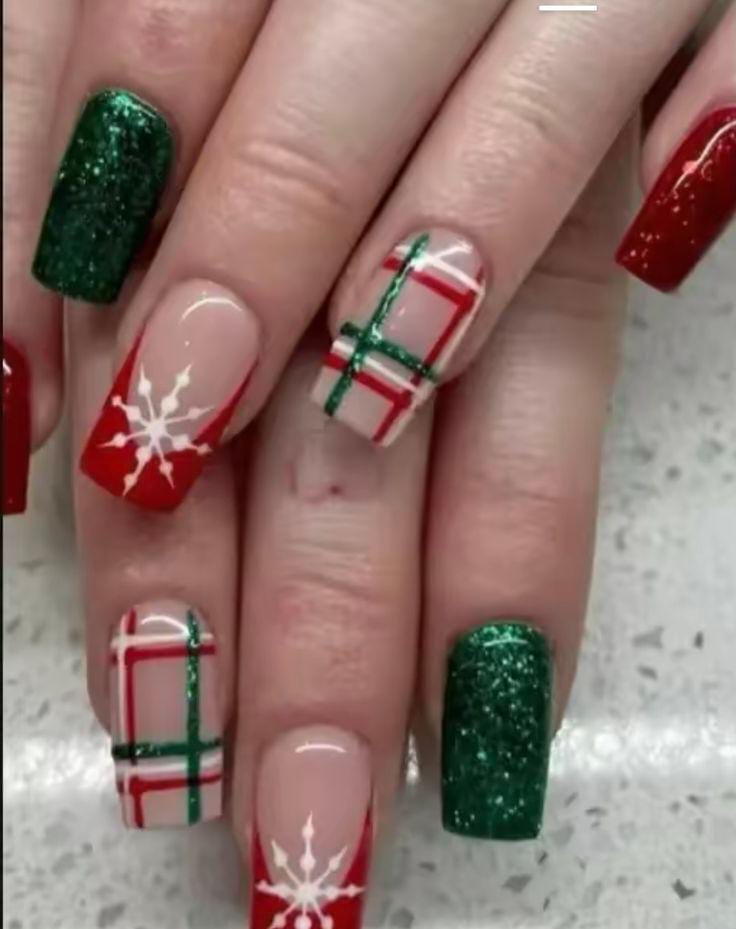 This cheerful design mixes red, green, and nude tones with plaid accents and white snowflakes, bringing a classic Christmas sparkle with a hint of glittery green glam.