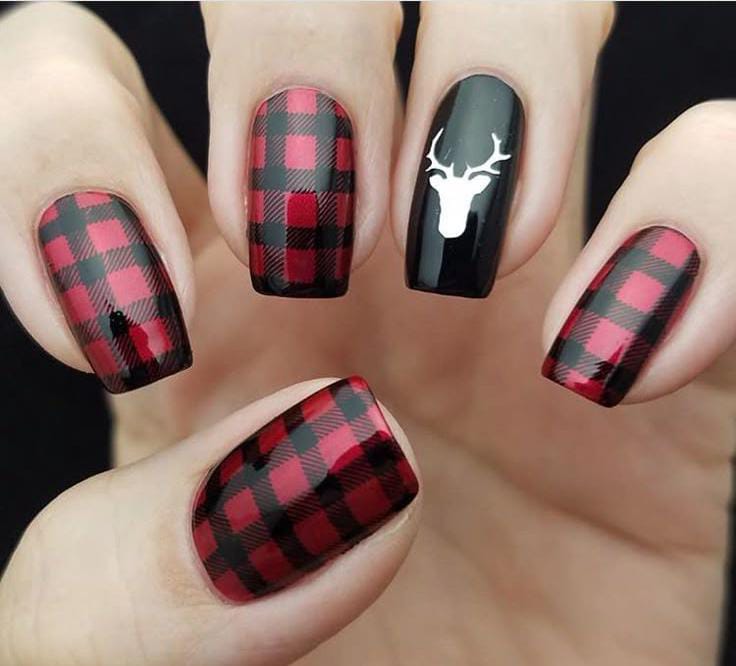 Bold red and black buffalo plaid nails are paired with a sleek black accent nail featuring a white reindeer silhouette for a cozy, rustic Christmas holiday vibe.