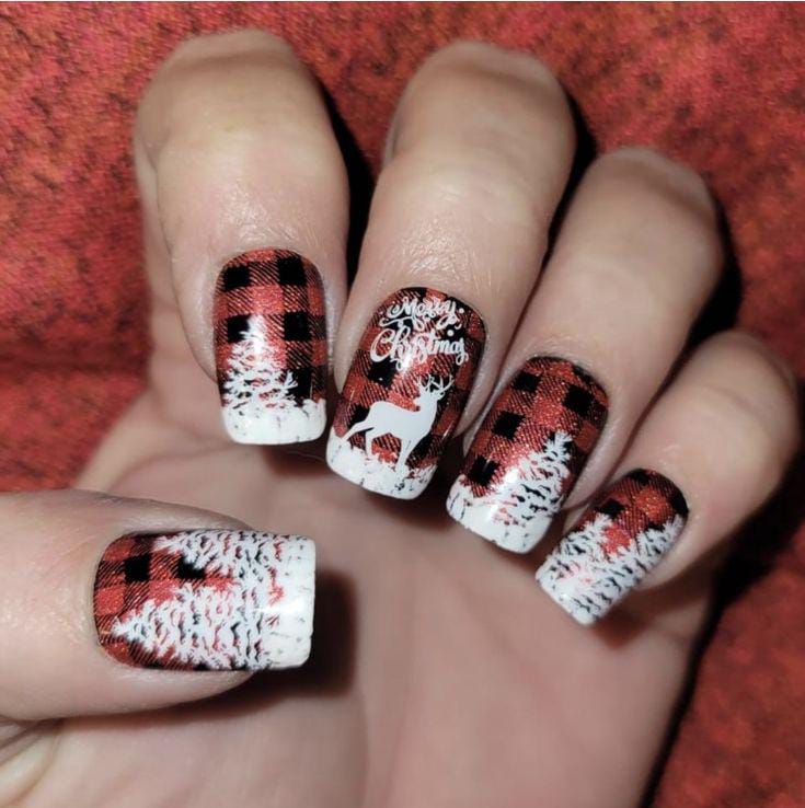 This wintery design combines red-and-black plaid with snowy white trees and reindeer details, capturing the cozy magic of a Christmas forest.