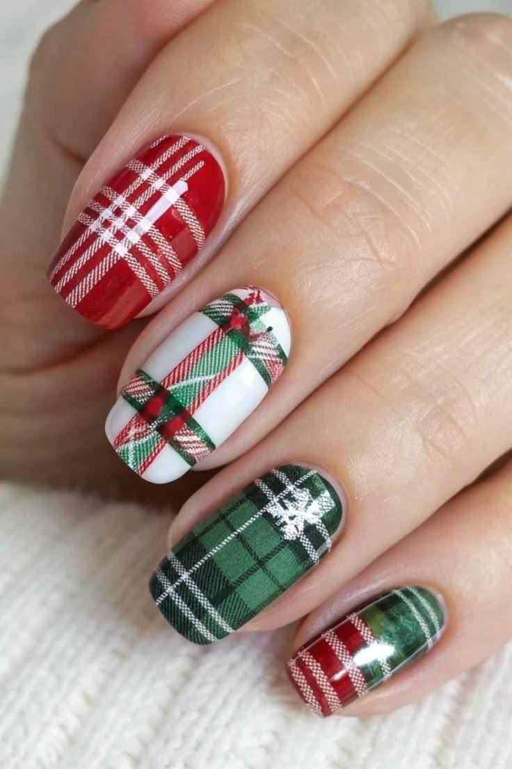 A cozy Christmas-inspired look featuring red and green nails with plaid accents. The mix of solid colors and crisp white lines gives it a cheerful, handmade Christmas holiday feel.