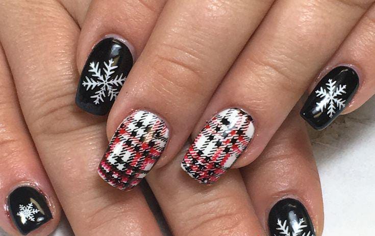 A mix of black, red glitter, and buffalo plaid decorated with white snowflakes for a striking winter- Christmas inspired style that’s both fun and dramatic.