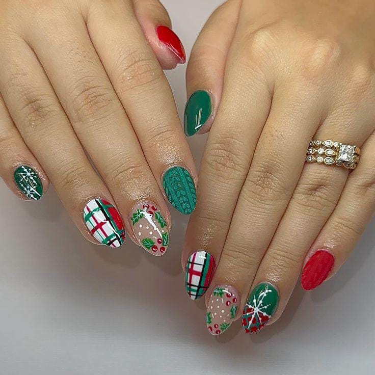 Bright red, green, and white nails decorated with detailed plaid patterns for a festive, cheerful vibe. The balanced color mix brings out a fun, Christmas sweater-like charm.